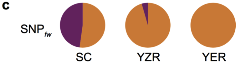 人工選擇在農(nóng)作物的馴化和遷徙的過程中具有重要的作用。群體結(jié)構(gòu)分析顯示當K=4時,YER與SC和YZR明顯不同(圖4 b,K=4)。通過兩兩群體間(SC vs. YZR, SC vs. YER, YZR vs. YER)的選擇性清除分析(FST)鑒定出了分別覆蓋到3,162,2,879和3,308個基因上的59,53和51個顯著遺傳分化的區(qū)域。SC和YZR之間的21個分化的區(qū)域(約43.5 Mb 含有915個基因)在群體SC和YER之間是保守的(圖7 a)。
