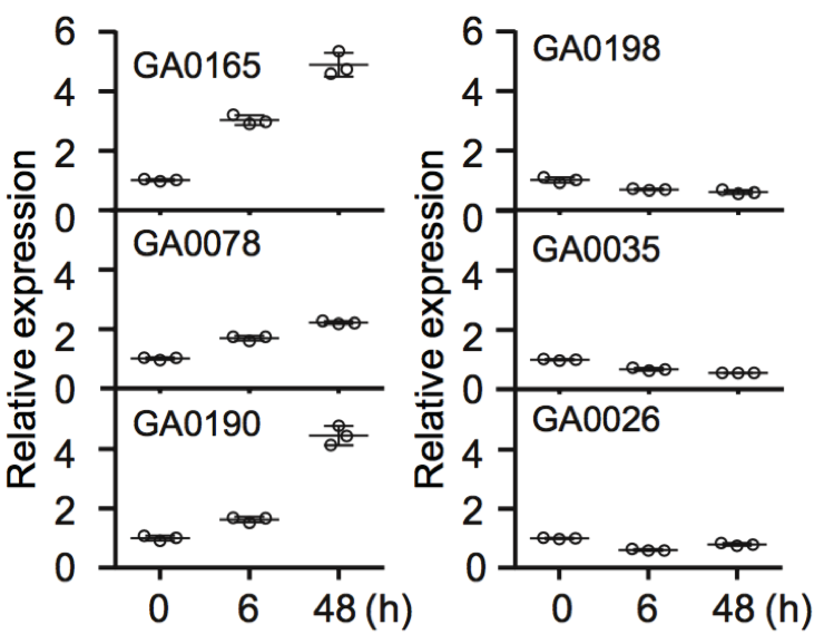 注:根部接種鐮刀霉菌,(高耐受型GA0165,GA0078和GA0190;高敏感型GA0198,GA0035和GA0026)