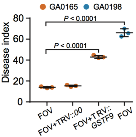 圖15 不同植株處理后的疾病感染指數(shù)比較(GA00198,GA0165,TRV::00和TRV::GSTF9,處理條件:接種FOV)