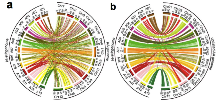 a. 亞洲棉原基因組與陸地棉基因組共線性分析;b. 亞洲棉更新基因組與陸地棉基因組共線性分析