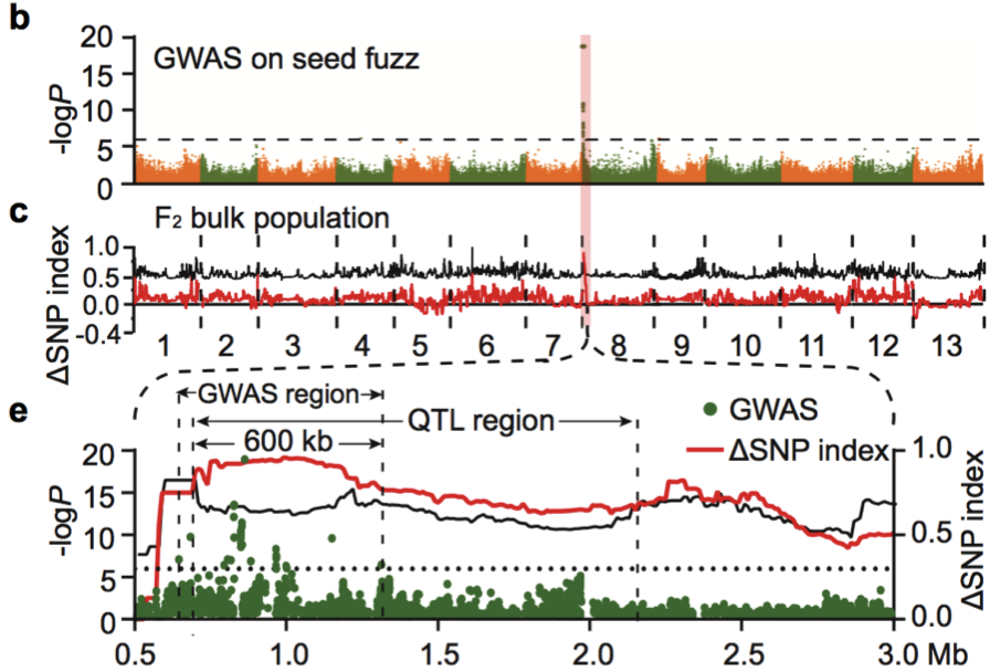 a 亞洲棉種子有絨(左)和無絨(右)表型;b GWAS關(guān)聯(lián)分析;c F2群體QTL分析;d F2群體的構(gòu)建 e GWAS和QTL聯(lián)合分析
