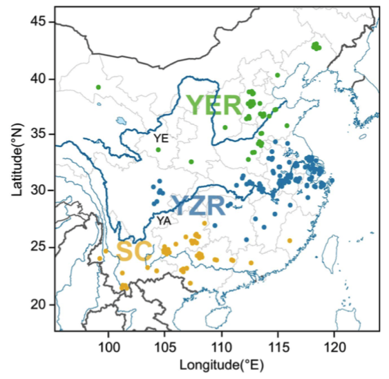 共計選擇了243份二倍體棉花材料:230份亞洲棉G. arboreum (A2) ?和13份草棉G. herbaceum (A1);材料來源:中國南部(SC),長江(YZR)和黃河(這些區(qū)域代表了中國二倍體棉花大部分的表型和地理多樣性)。
