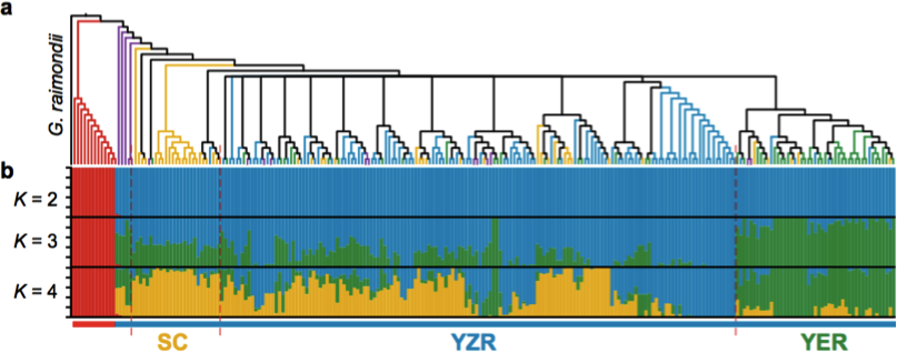 以雷蒙德氏棉(G. raimondii)為外群,利用72,419個SNPs構(gòu)建系統(tǒng)發(fā)育樹,顯示:G. herbaceum(草棉)和G. arboretum(亞洲棉)聚類成2個獨立的群(圖4 a-b)。G. arboretum(亞洲棉)進一步又分為SC,YZR和YER三個群,顯示了地理分布模式的差異,進而利用PCA分析支持這一結(jié)果(圖4 c)。同時發(fā)現(xiàn)了亞洲棉和草棉是由不同的祖先種馴化而形成。