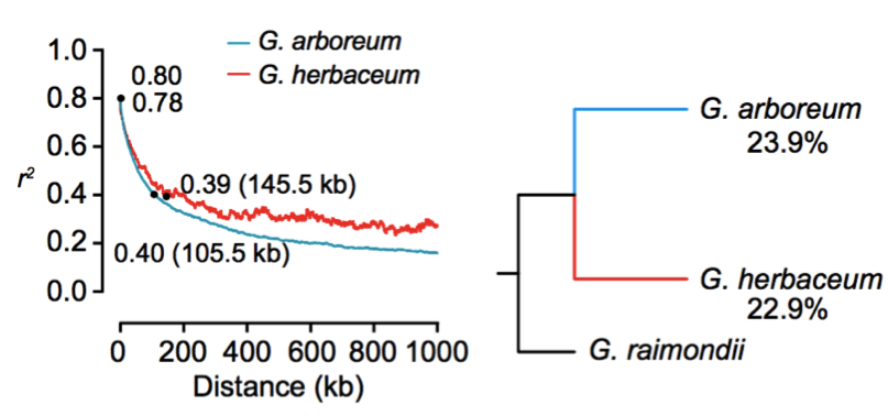 通過表型計算統(tǒng)計發(fā)現(xiàn),與長江和黃河區(qū)域的兩個不同地區(qū)的材料項目,中國南部的材料的表型相對匱乏。此外中國南部SC的亞洲棉(π=0.211×10-3)比長江流域YZR(π=0.197×10-3)和黃河流域YER(π=0.199×10-3)的亞洲棉的核苷酸多態(tài)性高,這表明了亞洲棉較早在中國南部地區(qū)種植,并進一步擴展到長江和黃河地區(qū),而這與之前基于SSR分析的結(jié)果一致;連鎖不平衡分析結(jié)果顯示,亞洲棉的LD衰減距離約為105.5 kb(r2=0.40),草棉的衰減距離約為145.5 kb(r2=0.39)(圖5),其LD衰減距離與大豆(約83 kb)和水稻(秈稻約123 kb;粳稻約167 kb)接近,但遠遠高于栽培玉米(22-30 kb)。大約有23.9%的亞洲棉和22.9%的草棉的等位基因與雷蒙德氏棉的基因組相一致,暗示了亞洲棉與草棉同時開始分化(圖6)。