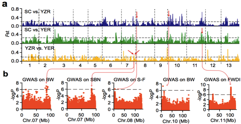 圖7 a. 亞洲棉SC,YZR和YER的選擇性清除分析;b. 全基因組關(guān)聯(lián)分析