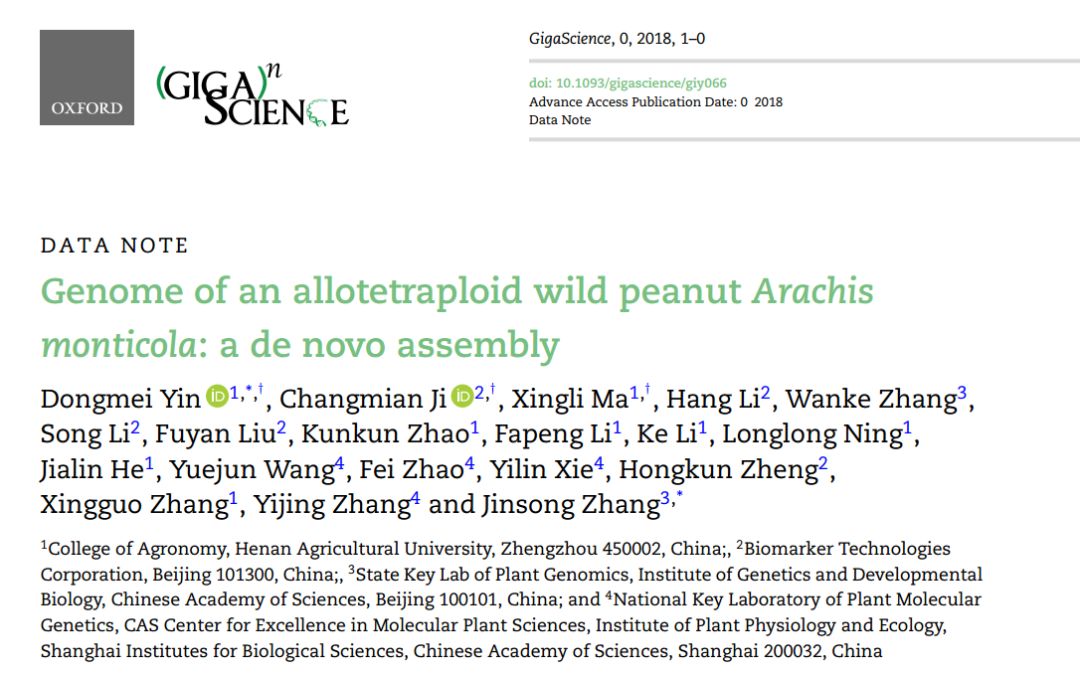 花生作為我國重要的經(jīng)濟作物,廣泛種植于熱帶和亞熱帶地區(qū),是提供重要的蛋白和油料的基礎(chǔ)。作為豆科的重要分支之一,花生屬一共包括30個二倍體品種,1個異源四倍體野生花生(A.monticola)和1個異源四倍體栽培花生(A.hypogaea)(2n = 4x = 40)。作為栽培花生農(nóng)藝性狀改良的重要野生資源供體,野生四倍體花生的基因組也一直是國內(nèi)外學(xué)者的研究熱點。成功破譯四倍體野生花生的基因組有助于科學(xué)家和育種專家對A.hypogaea起源及馴化過程的理解。河南農(nóng)業(yè)大學(xué)殷冬梅教授團隊與北京百邁客生物科技有限公司、中國科學(xué)院等多家單位聯(lián)合攻關(guān),成功破譯復(fù)雜的異源四倍體野生花生基因組密碼,相關(guān)成果于2018年6月19日發(fā)表在GigaScience上:“Genome of an allotetraploid wild peanut Arachis monticola: a de novo assemble”。