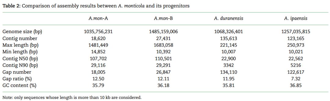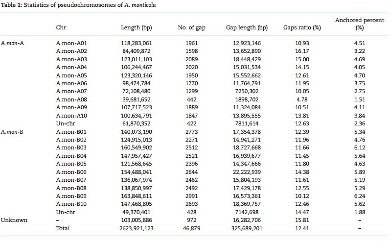 最終組裝出2.62Gb的基因組序列,保證組裝的完整性,又利用BioNano和Hi-C等方法對基因組進行區(qū)分最終A.monticola得到的subgenome與祖先A基因組A.duranensis、祖先B基因組A.ipaensis之間的比較如表2所示,野生花生A and B subgenomes與對應(yīng)的基因組大小相近,基因組的完整性和連續(xù)性都有了顯著提升,為后續(xù)的功能基因組研究打下了堅實的基礎(chǔ)。