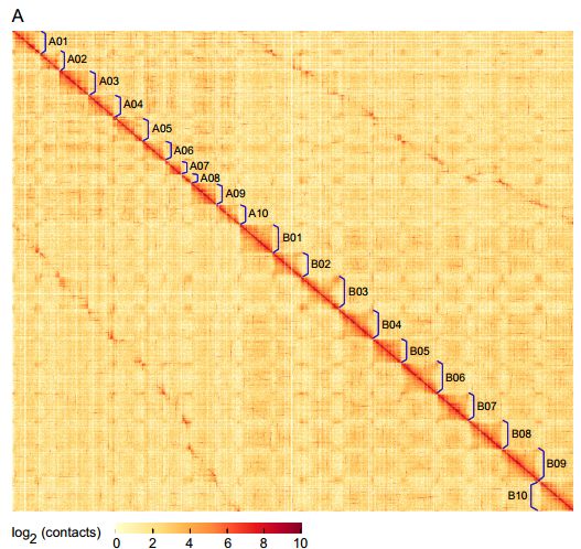 ????????除了常規(guī)基因組的評估手段之外,我們還利用更直觀的Hi-C對該基因組序列進行準(zhǔn)確性評估,并與其祖先種A和祖先種B進行了比較。比較栽培種A.monticola得到的subgenome與祖先A基因組A.duranensis, 祖先B基因組A.ipaensis的Hi-C熱圖,整體熱圖一致性非常高。(A圖是A.monticola的HiC熱圖,B圖祖先A基因組A.duranensis, 祖先B基因組A.ipaensis的Hi-C熱圖)