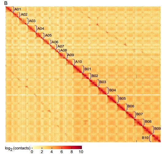 ????????通過K-mer分析預(yù)測該基因組的大小為2.42Gb(實際大小約為2.7Gb),重復(fù)序列為75%,基因組雜合度為0.1%。通過2015年發(fā)表在Nature Genetics上的2個祖先種序列可知A和B兩套亞基因組的同源性高達93%,屬于高度同源的異源四倍體基因組,甚至同源性超越了某些同源多倍體的基因組。