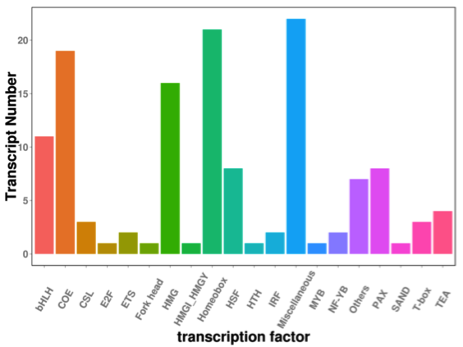 ????????轉(zhuǎn)錄因子也稱反式作用因子,在動植物的生長發(fā)育及其對外界環(huán)境的反應(yīng)中起著重要的調(diào)控作用,通過轉(zhuǎn)錄因子注釋或表達(dá)量聚類分析,挖掘調(diào)控生物表型的關(guān)鍵轉(zhuǎn)錄因子。