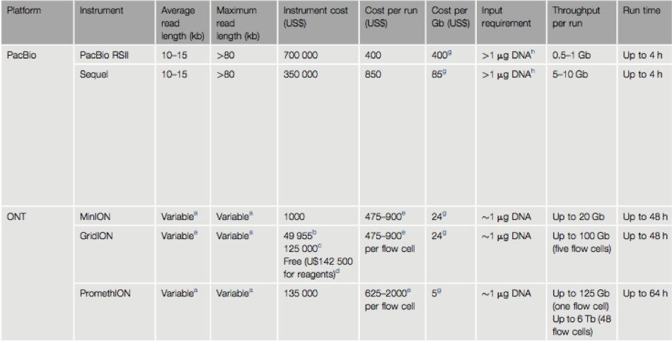 圖4 三代測(cè)序平臺(tái)PacBio和ONT測(cè)序平臺(tái)的比較[1]