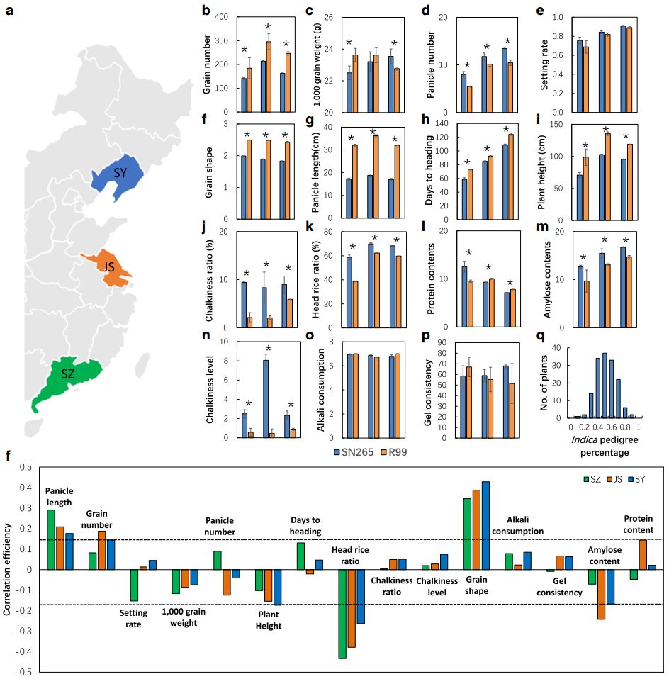 秈稻和粳稻為亞洲栽培水稻的兩個亞種,它們的地理分布以及形態(tài)學(xué)性狀差異明顯,揭示其農(nóng)藝性狀背后的遺傳基礎(chǔ)對于水稻生產(chǎn)非常重要,然而,其遺傳背景、生態(tài)條件以及農(nóng)藝性狀之間的關(guān)系尚不清楚。沈農(nóng)265(SN265)是我國第一個商用的超級稻,它作為中國北方骨干親本引領(lǐng)著育種方向。本研究利用二代和三代測序?qū)Ρ狈骄统壍維N265和R99進行測序,并獲取SN265高質(zhì)量基因組,又構(gòu)建了RIL群體重測序遺傳連鎖圖譜,并對多個重要農(nóng)藝性狀進行了QTL分析。此外,還發(fā)現(xiàn)若干基因功能隨生態(tài)環(huán)境的變化而改變,并且許多等位基因?qū)Σ煌倪z傳背景呈現(xiàn)差異性的響應(yīng)。