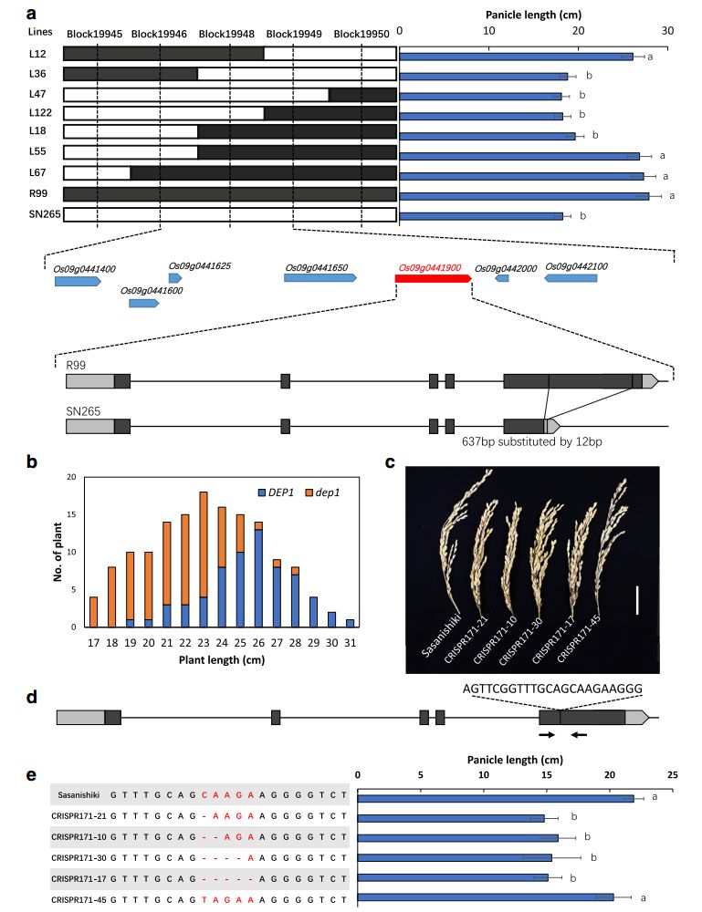 為了確定QTL簇的候選基因,進一步做了基因的精細定位。首先,關(guān)注的是chr9上的 qPL9簇,候選基因被定位在43kb的區(qū)間內(nèi),其中包含7個注釋基因,通過序列比對分析發(fā)現(xiàn)一個候選基因DEP1上的exon5中存在堿基序列的替換,即R99中637bp的片斷在SN265中被替換成12bp的序列;接著共分離分析發(fā)現(xiàn)SN265型的dep1具有明顯短于R99的穗長(圖5)。為了證明DEP1qPL9的候選基因,利用 CRISPR/Cas9技術(shù)對Sasanishiki品種中的DEP1基因誘變,獲得五個突變體株系,其中四個突變體發(fā)生移碼突變,呈現(xiàn)短穗長,另外一個突變體產(chǎn)生兩個氨基酸的替換,其穗長與Sasanishiki無顯著性差異(圖5),暗示DEP1qPL9簇中控制穗長的基因。