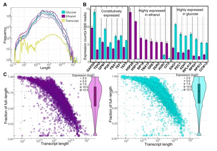 分別對葡萄糖條件和乙醇條件下生長的酵母進(jìn)行全長轉(zhuǎn)錄組測序,葡萄糖生長條件下的酵母 共計獲得~509 MB(59X)數(shù)據(jù)量,包含約 530,000 高質(zhì)量 reads,其中 N50 為 1150bp;乙醇條 件下的酵母共計獲得~623 MB(72X)數(shù)據(jù),約 623000 高質(zhì)量 reads,其中 N50 為 1263 bp。該 技術(shù)的比對率為 88%,錯誤率為 12%,其中超過 70%的轉(zhuǎn)錄本為全長轉(zhuǎn)錄本,鑒定長度最長轉(zhuǎn)錄 本超過 5kb。全長轉(zhuǎn)錄本的比例隨著轉(zhuǎn)錄本長度增加而減小,與轉(zhuǎn)錄本的表達(dá)量沒有明顯關(guān)系。有22 個轉(zhuǎn)錄本是明顯高表達(dá)的,比如 豐度最高的轉(zhuǎn)錄本之一, 的同源 基因,在兩個培養(yǎng)條件下表達(dá)量都很高;在乙醇條件下特異高表達(dá)一些與熱休克蛋白、氧化脅迫 相關(guān)的基因,其中 編碼檸檬酸合酶,說明此時激活了乙醛酸途徑;在葡萄糖培養(yǎng)條件下,與 有氧呼吸、核糖體相關(guān)的基因表達(dá)量較高,符合此條件下酵母生長更快的特征。