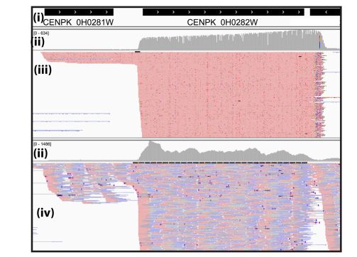 MinION 的數(shù)據(jù)中,我們發(fā)現(xiàn)相鄰的 2 個基因 PTH1 (CENPK0H0281W) 和 ERG9 (CENPK0H0282W) 轉(zhuǎn)錄在一個轉(zhuǎn)錄本中,有大量的 reads 跨越了基因間區(qū)。而 Illumina 的比對結(jié)果中, 在兩個 ORFs 之間的區(qū)域,比對到的 reads 不是完全覆蓋的,這種低置信度的信息很可能被忽略。