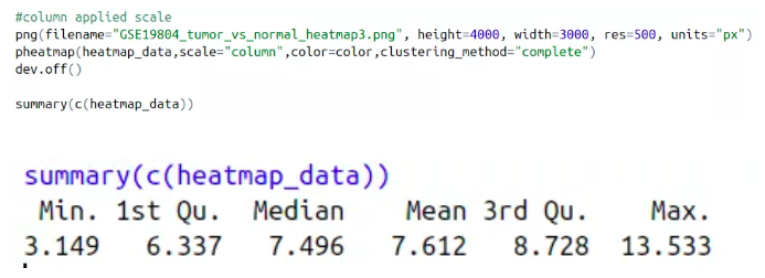 我們現(xiàn)在將數(shù)據(jù)進(jìn)行行均一化,聚類方法選擇complete,進(jìn)行均一化之后的熱圖還沒有前面的好看,查看數(shù)據(jù)表達(dá)情況,我們發(fā)現(xiàn)最小的表達(dá)值3.149和最大的表達(dá)值13.533之間并沒有相差很大,因此這套數(shù)據(jù)其實(shí)不適合做均一化處理,畫出來的熱圖更好看。