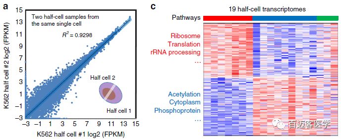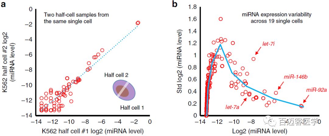 1、作者首先分別比較了來自同一細(xì)胞的半細(xì)胞單細(xì)胞microRNA測序和單細(xì)胞轉(zhuǎn)錄組測序之間的差異:該方法表現(xiàn)出良好的穩(wěn)健性(~95%成功率)和重現(xiàn)性(microRNA和mRNA的R2=0.93),產(chǎn)生可獨(dú)立驗(yàn)證的成對(duì)半細(xì)胞microRNA和mRNA表達(dá)譜。