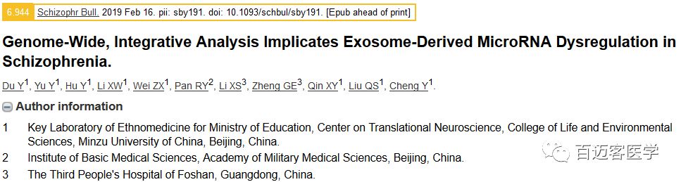 文獻(xiàn)二:Du Y, Yu Y, Hu Y, et al. Genome-Wide, Integrative Analysis Implicates Exosome-Derived MicroRNA Dysregulation in Schizophrenia[J]. Schizophr Bull. 2019 Feb 16.