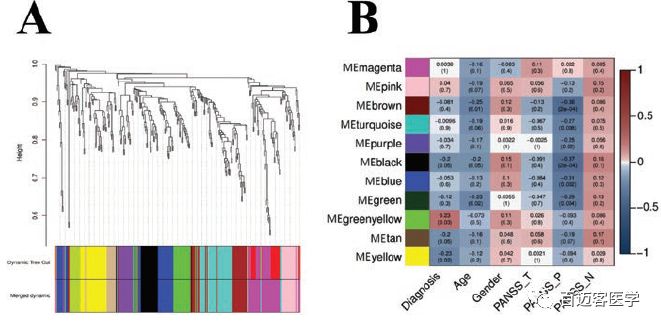 上述pooled set(49個(gè)SCZ患者?vs?46個(gè)HC對(duì)照)進(jìn)行miRNA WGCNA分析,共計(jì)鑒定到11個(gè)共表達(dá)的模塊,其中3個(gè)與疾病狀態(tài)顯著相關(guān)。