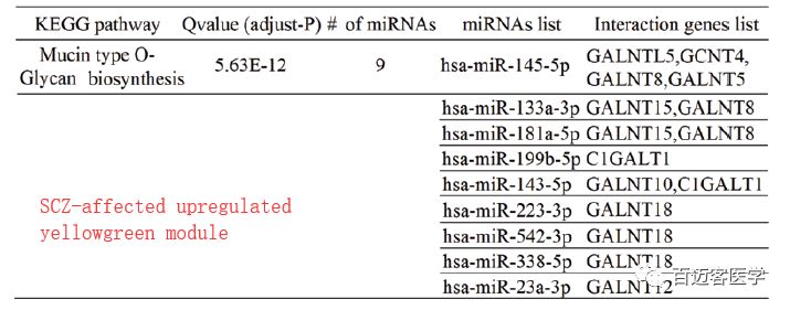 比如hsa-miR-206,其是SCZ患者的血液外泌體中最顯著上調(diào)的miRNA,并且之前報(bào)道其調(diào)節(jié)腦源性神經(jīng)營(yíng)養(yǎng)因子BDNF表達(dá)。顯著相關(guān)miRNA共表達(dá)模塊靶基因顯著富集到了O型聚糖的生物合成等通路,GO富集到了神經(jīng)遞質(zhì)轉(zhuǎn)運(yùn)蛋白、樹突棘和樹突發(fā)育相關(guān)term。