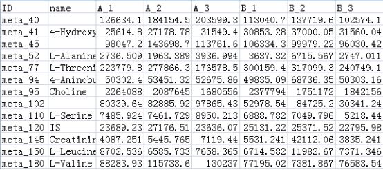 注:第一列為代謝物ID,第二列為代謝物定性名稱,第三列至最后為各個樣本的定量信息。