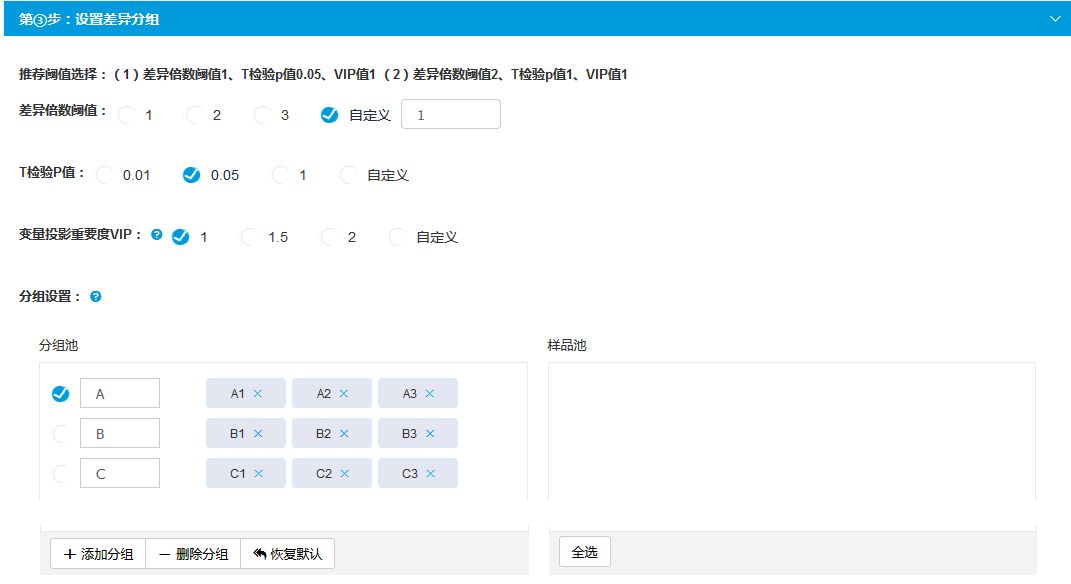 設(shè)置差異分析的條件:包括差異倍數(shù)、T檢驗p值、VIP值、以及差異分組