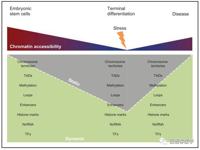 作者以此研究為基礎(chǔ),結(jié)合前人研究結(jié)果,構(gòu)建了發(fā)育和疾病發(fā)生中表觀基因組的變化模型(如下圖)。發(fā)育過程中伴隨著染色質(zhì)的變化,使最終分化的細(xì)胞具有穩(wěn)定的轉(zhuǎn)錄組,而疾病破壞了這種平衡,通過影響染色質(zhì)結(jié)構(gòu)、增強(qiáng)子-基因loop、組蛋白修飾、DNA甲基化等,將基因組的特定區(qū)域轉(zhuǎn)變?yōu)楦鼊討B(tài)的構(gòu)象。