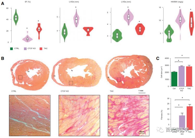 對CTCF-KO小鼠的表型呈現(xiàn)明顯的心肌病,失去CTCF會導(dǎo)致射血分?jǐn)?shù)受損、左心室擴(kuò)張以及器官和細(xì)胞水平的肌肉肥厚。而TAC小鼠也表現(xiàn)出肥厚,并伴有較輕微的心室大小和射血分?jǐn)?shù)的變化,這表明CTCF-KO和TAC小鼠代表了不同的病理生理模型。