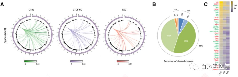 存在互作的9194個(gè)表達(dá)基因中,60%的基因在CTCF-KO和TAC中的互作變化方向相同。而剩余的40%基因中大多數(shù)(75%)是在某一組疾病細(xì)胞中虎作沒有發(fā)生變化的,25%是互作變化在兩組中相反的。在CTCF-KO和TAC中互作改變相同且差異表達(dá)的3651個(gè)基因中,絕大多數(shù)(86%)的局部互作減少(圖4B)。這些發(fā)現(xiàn)支持了這樣一種趨勢,即更多的動態(tài)染色質(zhì)互作影響基因表達(dá),兩組疾病細(xì)胞與對照相比,它們的基因表達(dá)變化方向更可能趨向一致?;プ鲾?shù)量top 40的差異表達(dá)基因在疾病細(xì)胞中的互作持續(xù)下降,如與鈣依賴信號和心肌肥厚相關(guān)的基因Ppp3ca。