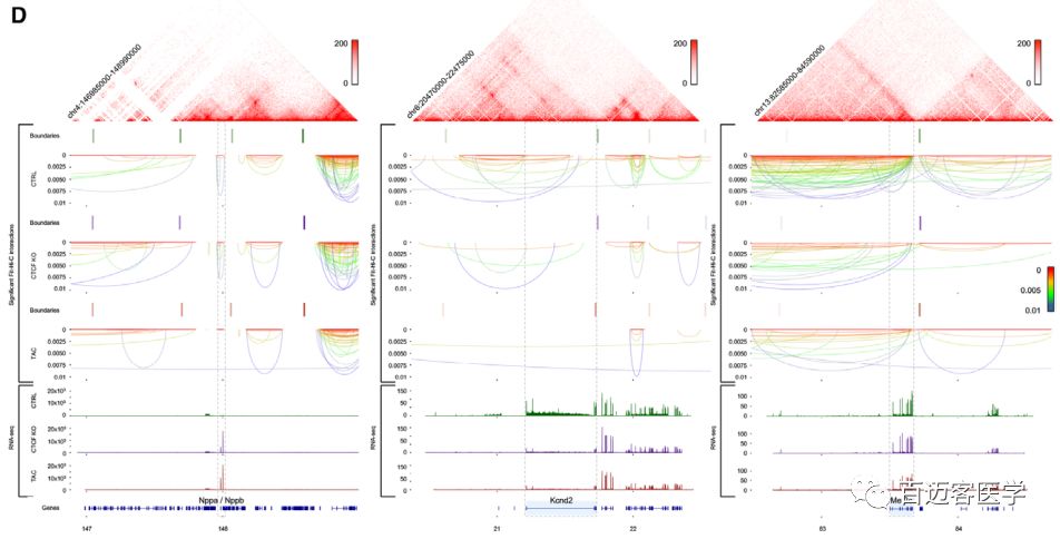 正常對照成年小鼠(CTRL)和兩個(gè)不同的疾病模型(TAC、CTCF-KO)小鼠的Hi-C結(jié)果揭示了5 kb分辨率下心肌細(xì)胞的基因組相互作用,得到了染色體內(nèi)和染色體間的互作事件,并為未來的心臟表觀基因組研究提供了依據(jù)。壓力超載或CTCF缺失選擇性地改變了TAD的邊界強(qiáng)度和A/B?compartment、基因組可及性。心力衰竭涉及致病基因周圍染色質(zhì)互作穩(wěn)定性的降低。此外,壓力超負(fù)荷或CTCF缺失重塑了心臟增強(qiáng)子的長距離互作,導(dǎo)致這些功能元件周圍局部染色質(zhì)互作顯著減少。
