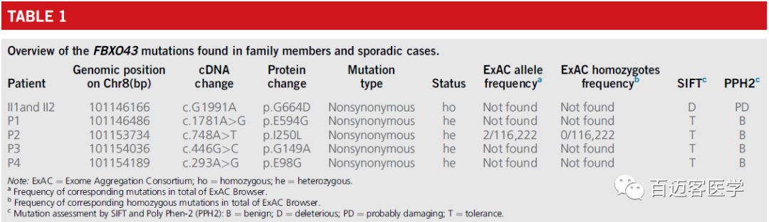 (注:該圖中除C1991T(G664D)外,其他突變?yōu)樵谏l(fā)樣本中發(fā)現(xiàn)的FBXO43基因突變)