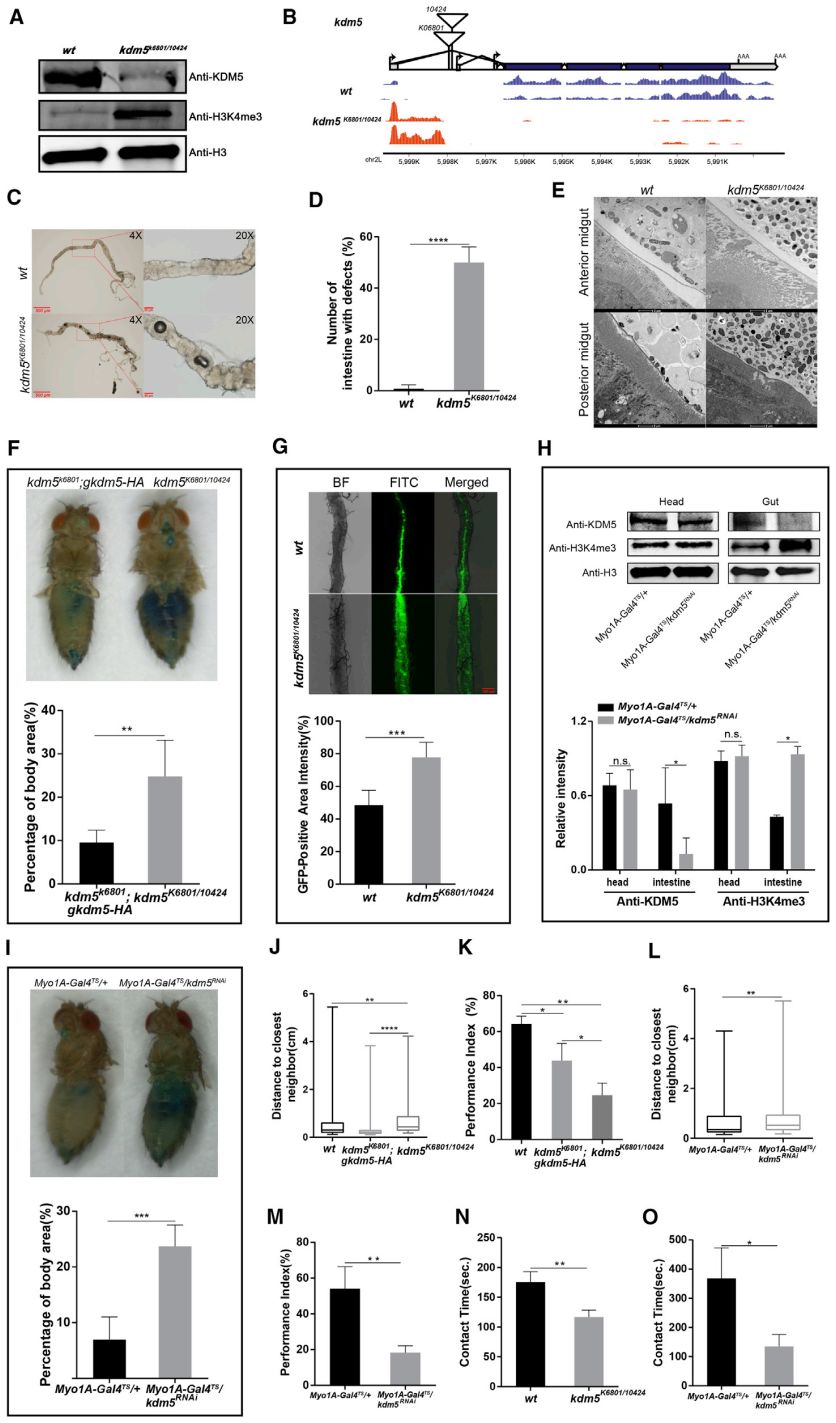 ?圖1. ?A:野生型(wt, w1118)和基因敲除型(kdm5K6801/10424)果蠅的KDM5, H3K4me3和組蛋白H3水平(Western blot);B:wt和kdm5K6801/10424果蠅腸道組織KDM5轉(zhuǎn)錄水平(RNA-seq);C:wt和kdm5K6801/10424果蠅消化道影像,紅框內(nèi)的斑點(diǎn)指示有腸道缺陷(氣泡);D:3-5齡wt和kdm5K6801/10424果蠅的腸道缺陷(氣泡)比例;E:透射電鏡觀察wt和kdm5K6801/10424果蠅前、后中腸上皮屏障;F:藍(lán)色食用染料標(biāo)記、測量wt和kdm5K6801/10424果蠅的腸滲透性;G:異硫氰酸熒光素(FITC)標(biāo)記的玻璃粉指示kdm5K6801/10424果蠅消化道滲透性較高;H:Myo1A-Gal4 TS/+和Myo1A-Gal4 TS/kdm5RNAi果蠅的頭、腸組織的KDM5, H3K4me3和組蛋白H3水平(Western blot);I:藍(lán)色食用染料標(biāo)記、測量Myo1A-Gal4TS/+和Myo1A-Gal4 TS/kdm5RNAi果蠅的腸滲透性;J、K和N:與wt果蠅相比,kdm5K6801/10424果蠅的接觸距離變遠(yuǎn)、交往活躍度下降、雌性社交接觸時(shí)間變短;L、M和O:與Myo1A-Gal4 TS果蠅相比,Myo1A-Gal4 TS/kdm5RNAi果蠅也發(fā)生了接觸距離變遠(yuǎn)、社交活躍度下降、雌性交往接觸時(shí)間變短。