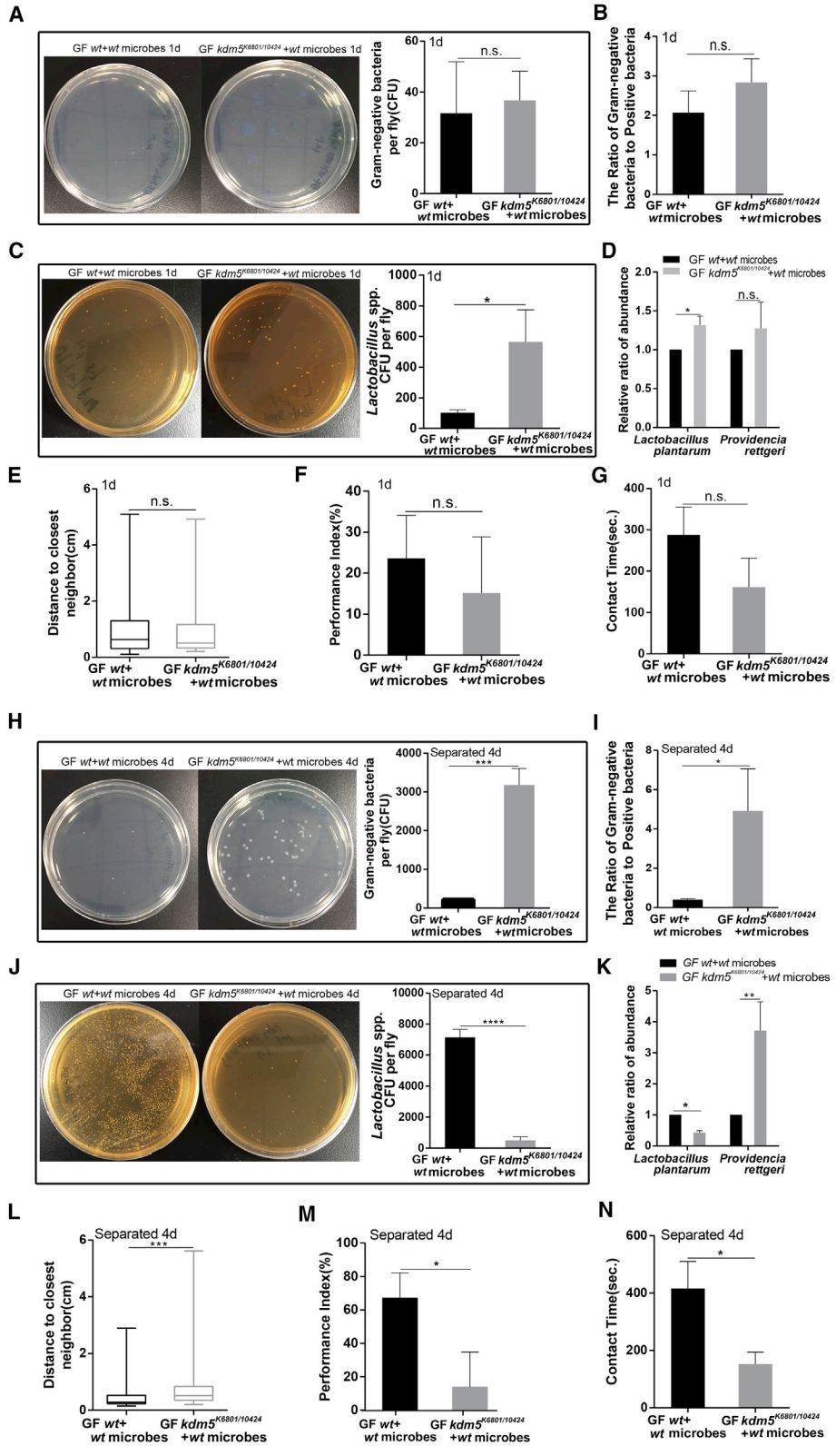 ?圖3. A-E:采用wt果蠅的菌群重塑后,1日齡無菌wt和kdm5K6801/10424果蠅的腸道革蘭氏陰性菌數(shù)量(CFU/只)、乳酸菌(Lactobacillus spp.)數(shù)量(CFU/只)、革蘭氏陰性菌與陽性菌的比例、L. plantarum L168和P. rettgeri P6相對豐度(RT-PCR)、接觸距離、社交活躍度、雌性交往接觸時(shí)間比較;F-N:采用wt果蠅的菌群重塑后,4日齡無菌wt和kdm5K6801/10424果蠅的比較(同上述A-E)。