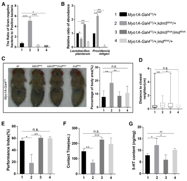 圖7. A:四組(Myo1A-Gal4TS/+、Myo1A-Gal4TS/+; kdm5RNAi/+、Myo1A-Gal4TS/+; kdm5RNAi/ imdRNAi和Myo1A-Gal4TS+; imdRNA/+)果蠅的腸道革蘭氏陰性菌與陽性菌的比例;B:四組(如圖A)果蠅的腸道L. plantarum L168和P. rettgeri P6相對豐度;C:四組果蠅的腸滲透性、接觸距離、交往活躍度、交往接觸時(shí)間、5-羥色胺(5-HT)濃度比較。