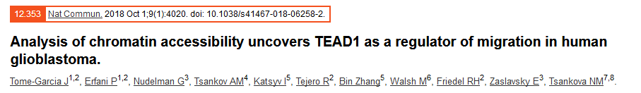 Tome-Garcia J, Erfani P, Nudelman G, et al. Analysis of chromatin accessibility uncovers TEAD1 as a regulator of migration in human glioblastoma[J]. Nature Communications, 2018, 9(1).