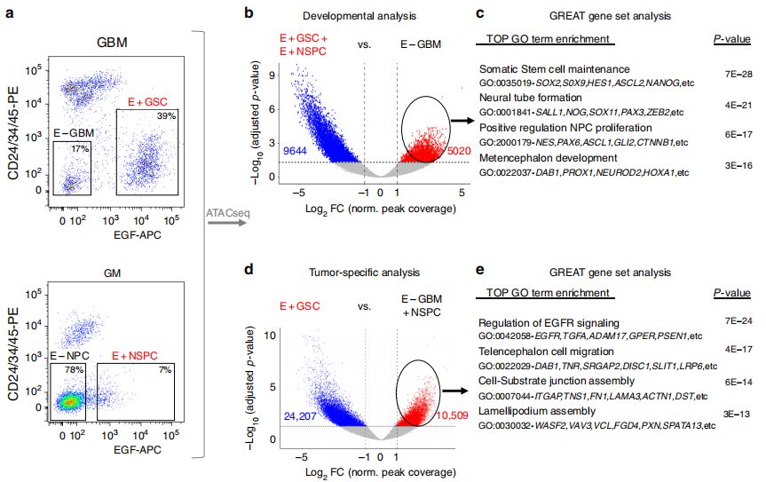 在此,作者從人GBM和生發(fā)層(GM)組織中直接分離出GSC和神經(jīng)干細胞/祖細胞(NSPC),基于ATAC-seq研究在相似的發(fā)育背景下腫瘤發(fā)生的內(nèi)在轉(zhuǎn)錄調(diào)控因子及其調(diào)控機制。