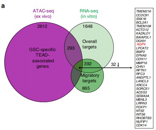 GSC中TEAD1可接近區(qū)域peak(ATAC-seq)和基因表達水平(RNA-seq)的一致性分析,結(jié)合GBM中TEAD1與基因共表達(TCGA中的GBM RNA-seq數(shù)據(jù))分析,發(fā)現(xiàn)TEAD1的靶基因包括EGFR、AQP4、CDH4、TNC等多個候選靶基因。