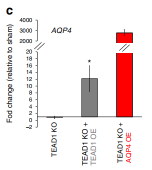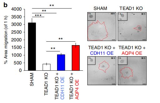 作者通過ATAC-seq和轉(zhuǎn)錄組測序數(shù)據(jù)篩選出來TEAD1的候選靶基因,并進一步利用ChIP-PCR,驗證了與TEAD1結(jié)合的靶基因–AQP4、EGFRCDH4。TEAD1敲除使AQP4下調(diào),TEAD1過表達可恢復(fù)AQP4的表達,而TEAD1和AQP4過表達均可修復(fù)TEAD1KO細胞的遷移缺陷,說明TEAD1作用于靶基因AQP4,調(diào)控其表達,進而參與GBM遷移的直接調(diào)控機制。