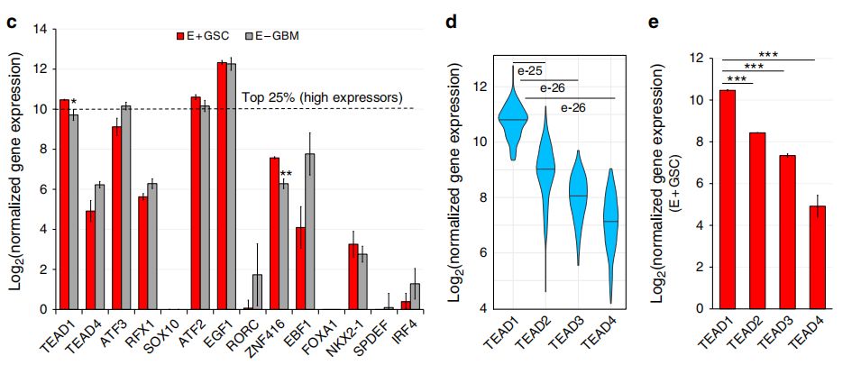通過ATAC-seq分析染色質(zhì)的可及性,不僅可以識別轉(zhuǎn)錄的調(diào)控區(qū)域,還可以推斷出其中的TF活性。在此,作者鑒定了27個GSC腫瘤特異性的TF motif,26個在E+GSC和E+NSPC中共有的發(fā)育相關(guān)TF motif。其中,TEAD1/4是具有很高活性的TF( motif是GSC特有peak中顯著富集,且基因表達水平高),其它候選TF包括ATF3、RFX1、FOXA1等。而E+GSC和E+NSPC中共有的發(fā)育相關(guān)TF包括SOX1、IRF3、NFIA等。然后,作者利用以前的類似的E+/E-GBM的RNA-seq數(shù)據(jù),考慮到腫瘤特異性TF的基因表達水平,其中只有TEAD1在E+GSC中差異過表達。