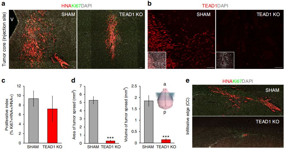此外,作者分析了所有TEAD家族成員(1-4)在TCGA數(shù)據(jù)庫RNA-seq數(shù)據(jù)中的表達水平,發(fā)現(xiàn)TEAD1是150個GBM樣本中表達最高的TEAD家族成員,且在蛋白水平上,TEAD1在PDX膠質(zhì)瘤中表達。因此,TEAD1是GBM腫瘤中表達最高、表達最廣泛的TEAD家族成員。