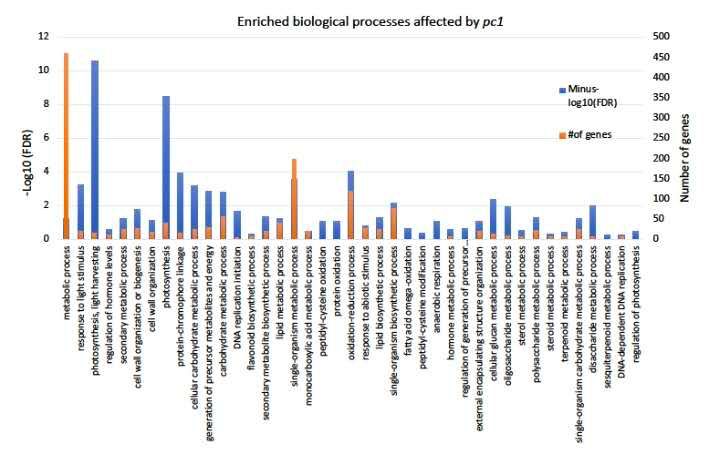 為研究pc1參與影響的細胞學過程,本研究對混池間983個差異表達基因進行GO富集分析并根據生物過程進行分類(圖5)。最顯著的GO term過程與光合作用及氧化還原有關,這兩個過程包含184個DEGs,被分成17個亞類,其中最大的一類是氧化還原過程。這一類基因與葉綠素合成下調有關,例如,POR,CAOHEMA1,還與葉綠素降解基因上調有關,例如,CA00g73130,暗示葉綠素合成與降解受這個QTL調控。另一類重要基因,包含Chlorophyll a/b-結合蛋白的多個成員基因(CA01g17090,CA02g12050,CA02g12060,CA02g12070等),在淡綠混池中下調表達,它們參與光合、蛋白發(fā)色團及光刺激響應等過程。另外,若干與碳固定有關的Rbc家族基因在淡綠混池中也呈現下調表達。