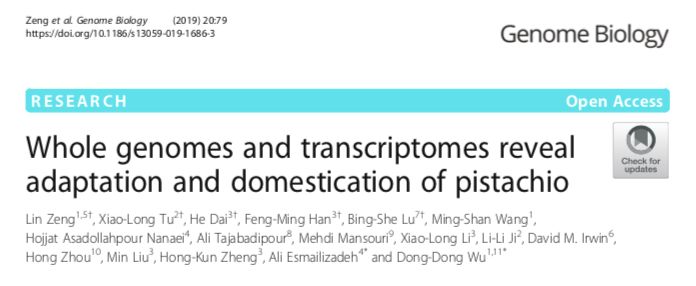 2019年04月18日,Genome Biology在線發(fā)表了中國科學院昆明動物研究所與北京百邁客生物科技有限公司共同合作文章“Whole genomes and transcriptomes reveal adaptation and domestication of pistachio” 中國科學院昆明動物研究所研究員吳東東為本文通訊作者,中國科學院昆明動物研究所曾琳,北京百邁客公司大項目負責人韓鳳鳴,戴鶴為共同第一作者。本文繪制了開心果的基因組草圖,并對其進行了大規(guī)模的基因組重測序并進行了比較基因組分析,表明,開心果的應激適應可能與細胞色素P450和幾丁質(zhì)酶基因家族的擴增有關。尤其重要的是,比較轉(zhuǎn)錄組學分析表明茉莉酸(JA)生物合成途徑在開心果耐鹽性中起著重要作用。此外,研究人員對93個栽培種和14個野生種(P. vera)基因組及35個親緣關系密切的野生黃連木屬基因組進行了重測序,以提供對種群結構、遺傳多樣性和馴化的見解與思路。