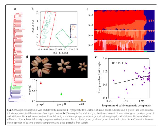 基于重測序數(shù)據(jù),研究人員推測了這些物種的有效群體大小的變化,并發(fā)現(xiàn)在 Pleistocene期間發(fā)生了瓶頸事件,且在 ~200 kyr前,有效群體大小增加。系統(tǒng)發(fā)育樹顯示馴化和野生開心果之間的分離(圖4a)。利用δaδi推算野生和馴化開心果的分化時間在 ~8000年前,這與早在公元前6750年就表明開心果種子是一種常見的食物這一考古記錄相似。為了深入了解開心果種質(zhì)之間的遺傳關系,研究人員進行了兩項經(jīng)典分析:群體結構和主成分分析(圖4b,c)。這些分析清晰的顯示栽培種質(zhì)分為兩個群。栽培種Group I的LD最高,栽培種Group II和野生開心果的LD衰減值相近。Group II包括 Qazvini,Italiaei和Badami