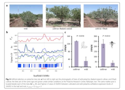 在本研究中,為了更好地了解開心果馴化的分子進化歷史,研究人員組裝了開心果的基因組草圖,并對107個全基因組進行了重測序,包括93個馴化和14個野生的開心果以及35個不同野生黃連木屬物種。整合基因組和轉(zhuǎn)錄組學分析顯示,擴張的基因家族(如細胞色素P450和幾丁質(zhì)酶)和茉莉酸(JA)生物合成途徑可能參與應激適應。比較群體基因組分析顯示,開心果大約在8000年前被馴化,馴化的關鍵基因可能是那些涉及樹木和種子大小的基因,這些基因經(jīng)歷了人工選擇。這些基因組序列應該有助于未來的研究,以了解沙漠作物的農(nóng)業(yè)和環(huán)境相關特性的遺傳基礎。