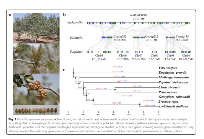 作者首先進行了比較基因組研究,以評估該物種的古歷史。利用9個植物基因組單拷貝家族基因的系統(tǒng)基因組分析表明,開心果在58百萬年前從柑橘中分離并在105百萬年前從毛果楊中分離出來。4DTV結果表明,開心果基因組在其與這些物種的分化之后沒有經(jīng)歷譜系特異性的全基因組復制。文中還通過將開心果基因組與基礎被子植物無油樟基因組進行共線性分析,表明每個無油樟區(qū)域最多有三個開心果區(qū)域,而每個開心果區(qū)域最多有兩個毛果楊區(qū)域(圖1b)。共線性分析支持這樣一個結論:開心果中沒有發(fā)生譜系特異性基因組復制,但它們與真雙子葉植物中發(fā)生的γ復制相同,而毛果楊經(jīng)歷了譜系特異性基因組復制事件。