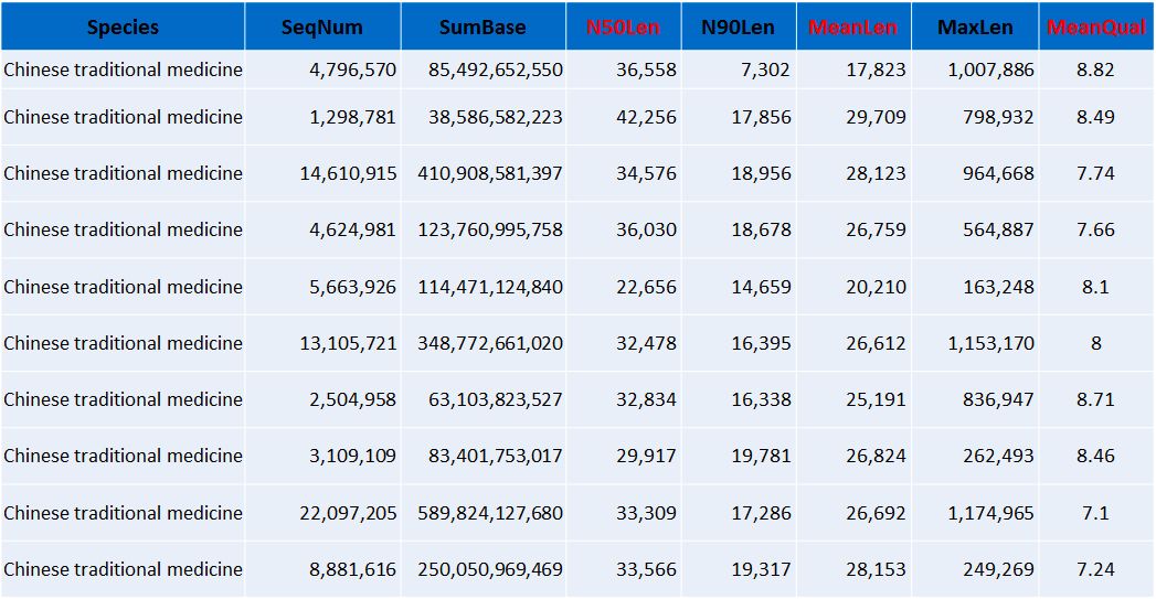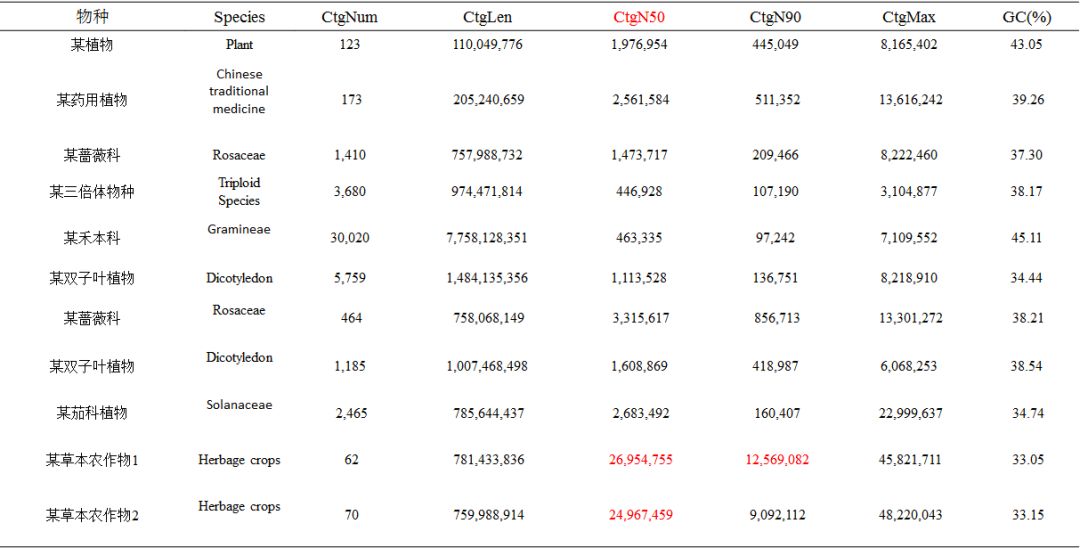 以上是總結(jié)的部分作物類、林木類、動物、水產(chǎn)和中藥材的下機數(shù)據(jù)結(jié)果展示,從以上的數(shù)據(jù)不難看出,平均raeds長度幾乎均在20Kb以上,最長reads高達(dá)1.6Mb以上(不同樣品DNA抽提難易程度不同,會造成一定的影響)。