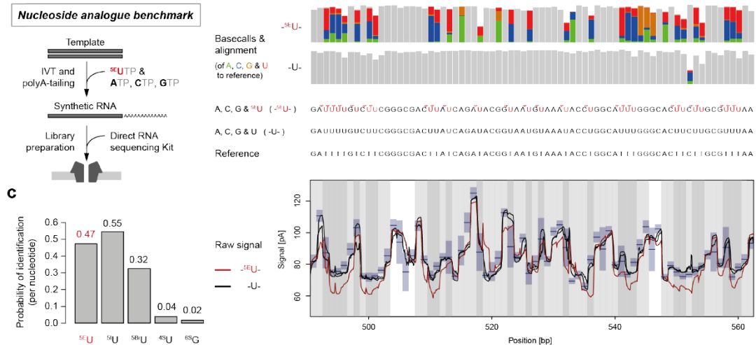 一個(gè)主要挑戰(zhàn)是尋找合適的核苷類似物用于RNA標(biāo)記和檢測(cè)標(biāo)記的RNA isoform,已知標(biāo)記效率限制在約2-3%,即100個(gè)天然核苷酸中只有2個(gè)或3個(gè)被核苷酸類似物取代。作者利用ERCC標(biāo)準(zhǔn)品,分別以添加核苷酸類似物和不添加的天然堿基作體外轉(zhuǎn)錄,將體外轉(zhuǎn)錄產(chǎn)物進(jìn)行nanopore direct RNA測(cè)序,比較了幾種不同的核苷酸類似物:5EU(5-Ethynyluridine,5-乙炔基尿苷)、5BrU(5-bromouridine,5-溴尿苷)、5IU(5-iodouridine,5-碘尿苷)、4sU(4-thiouridine,4-硫代尿苷)和?6sG(6-thioguanine,6-硫鳥嘌呤)。最終結(jié)果表明:5EU和5IU標(biāo)記檢出率比較高,且5EU對(duì)細(xì)胞無(wú)毒性。且5EU標(biāo)記的新合成RNA中約有一半U(xiǎn)可以被識(shí)別為5EU,且從原始電信號(hào)中可以明顯區(qū)分5EU和天然U堿基。選用5EU進(jìn)行體內(nèi)實(shí)驗(yàn)。