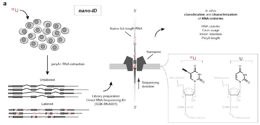 因此作者開(kāi)發(fā)了nano-ID(nanopore sequencing-based Isoform Dynamics ),其結(jié)合了代謝RNA標(biāo)記、天然RNA分子的“長(zhǎng)讀長(zhǎng)”納米孔測(cè)序和機(jī)器學(xué)習(xí)。