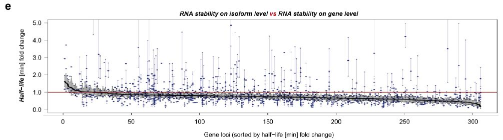 真核基因通常產(chǎn)生多種RNA isoform,其可產(chǎn)生功能上不同的蛋白質(zhì)變體。然而,RNA isoform的合成和穩(wěn)定性鮮少了解。原因是目前量化RNA代謝的方法是不能檢測(cè)RNA isoform的“短讀長(zhǎng)”測(cè)序。