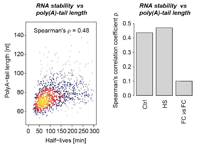 熱休克反應(yīng)(42°C 60min)處理,許多RNA isoform改變了合成速率、穩(wěn)定性和剪接模式。nano-ID分析結(jié)果表明,對(duì)于某一個(gè)基因座對(duì)應(yīng)的組合RNA混合物(基因水平)的代謝變化與單一轉(zhuǎn)錄本代謝變化差異非常大。雖然組合的RNA穩(wěn)定性與poly(A)尾巴長(zhǎng)度相關(guān),但是單個(gè)RNA isoform可以顯著偏離。nano-ID能夠在不同細(xì)胞狀態(tài)和條件下研究單個(gè)RNA分子和isoform水平的RNA代謝。